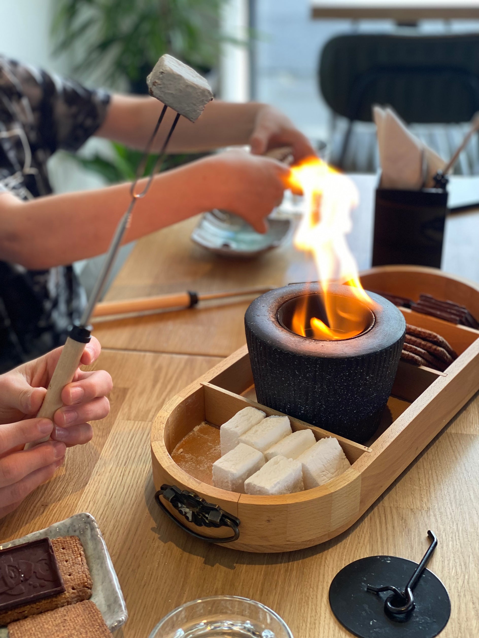 Enjoy toasting your marshmallows on our table top campfires and sandwiching them between our house made graham crackers and craft chocolate at Miann Ponsonby only